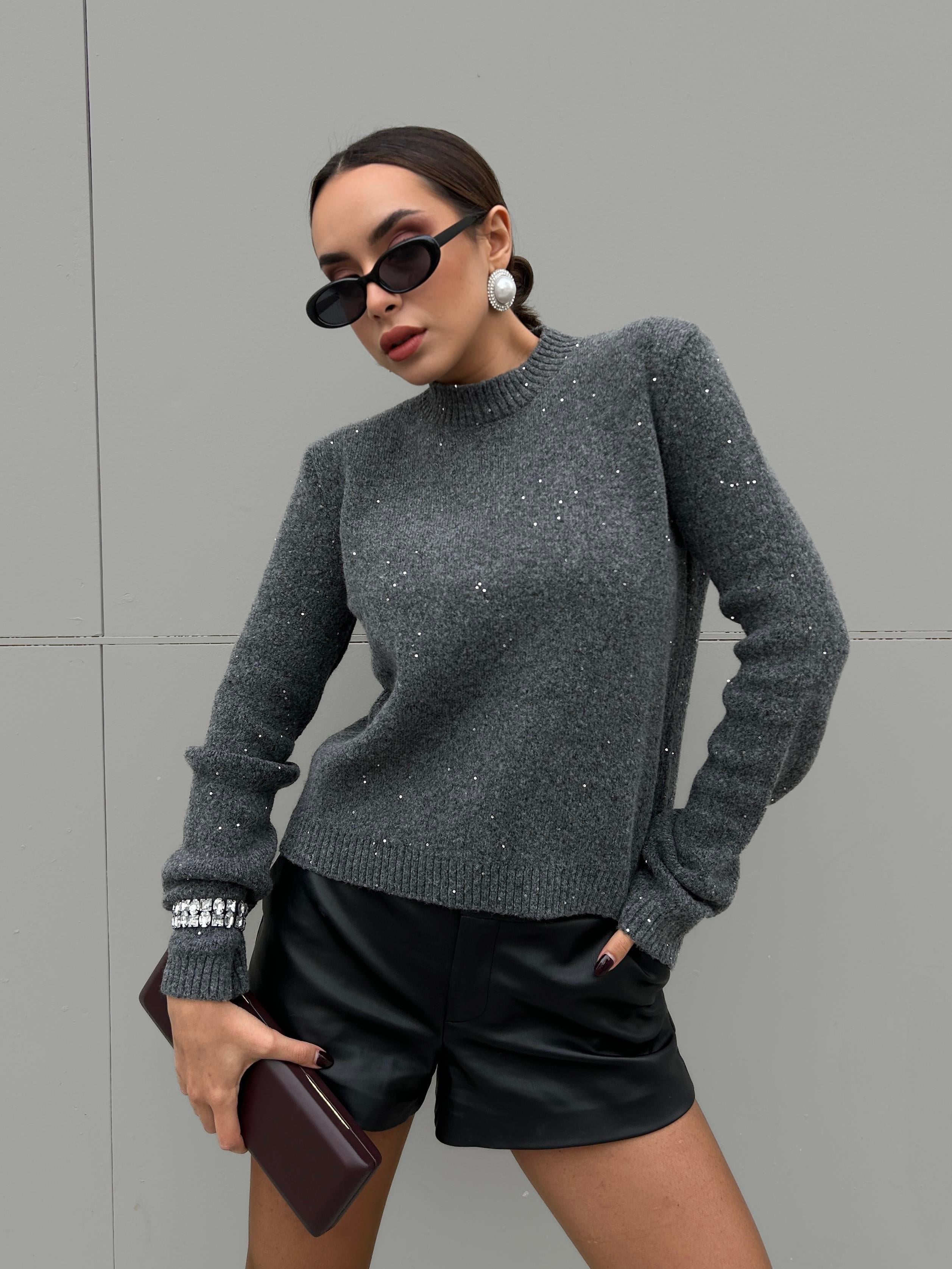 Kadın Antrasit Triko Pullu Simli Bisiklet Yaka Kazak 5591