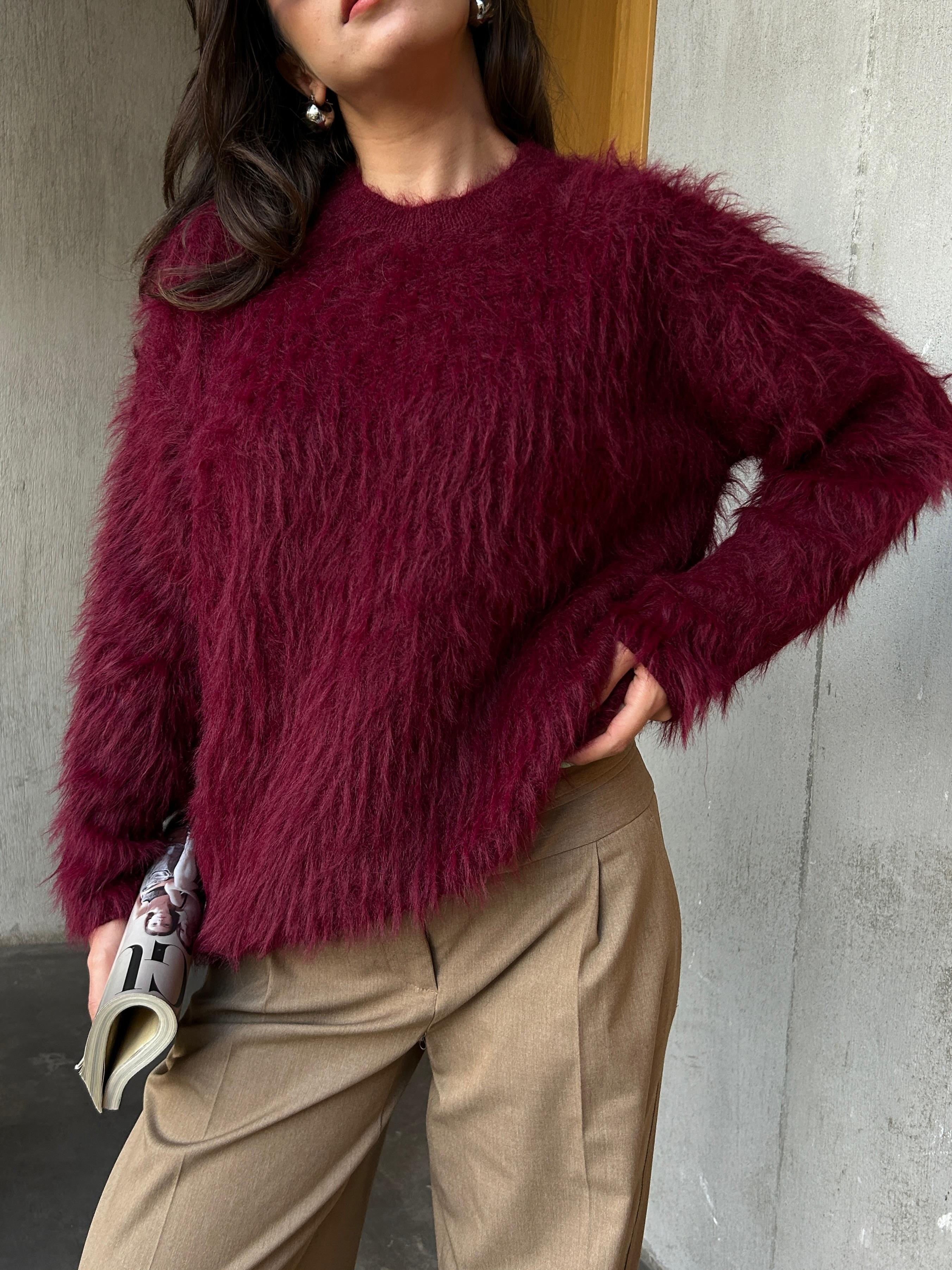 Kadın Bordo Bisiklet Yaka Peluş Kazak 90