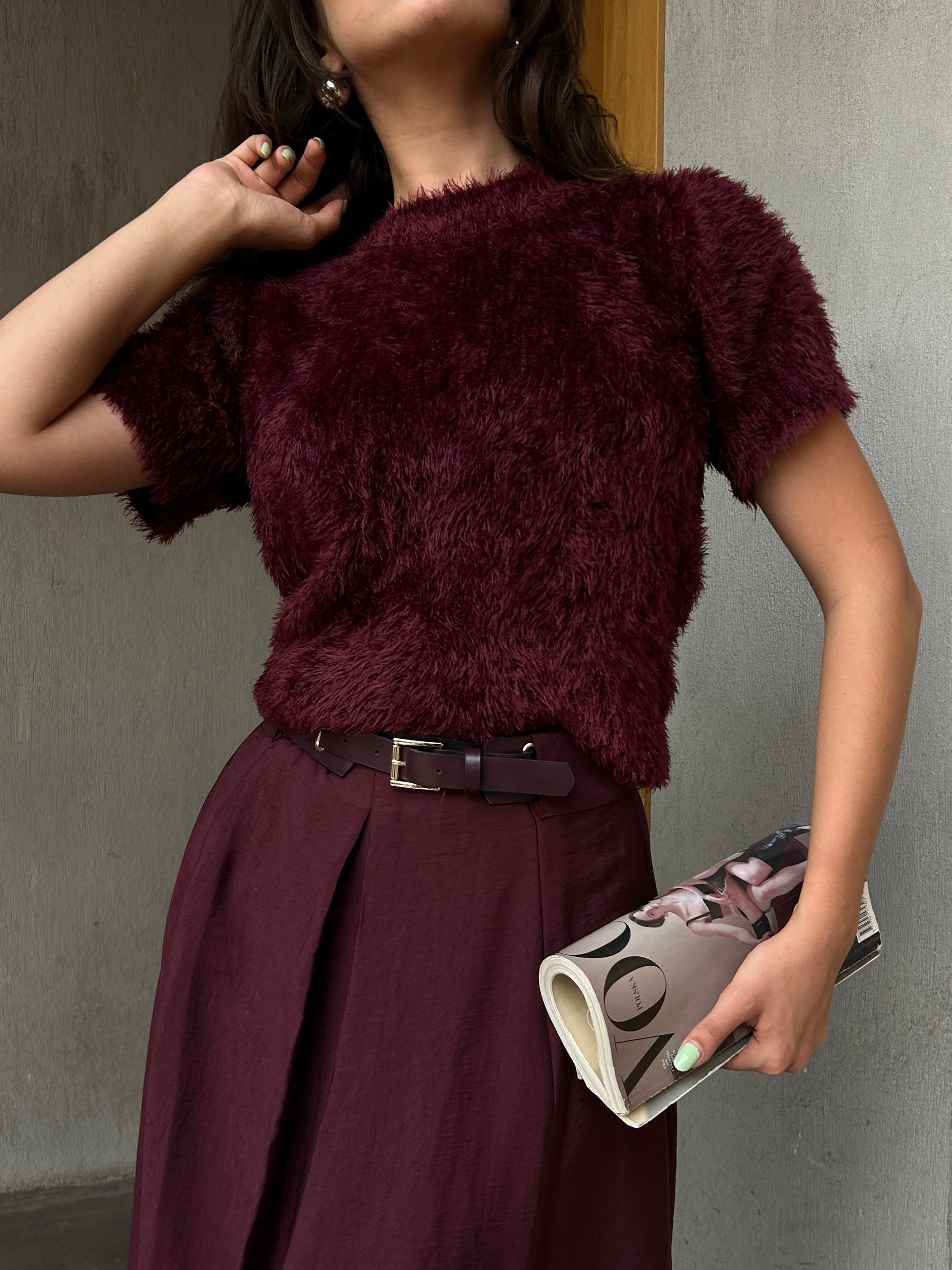 Kadın Bordo Kısa Kollu Peluş Kazak 5282