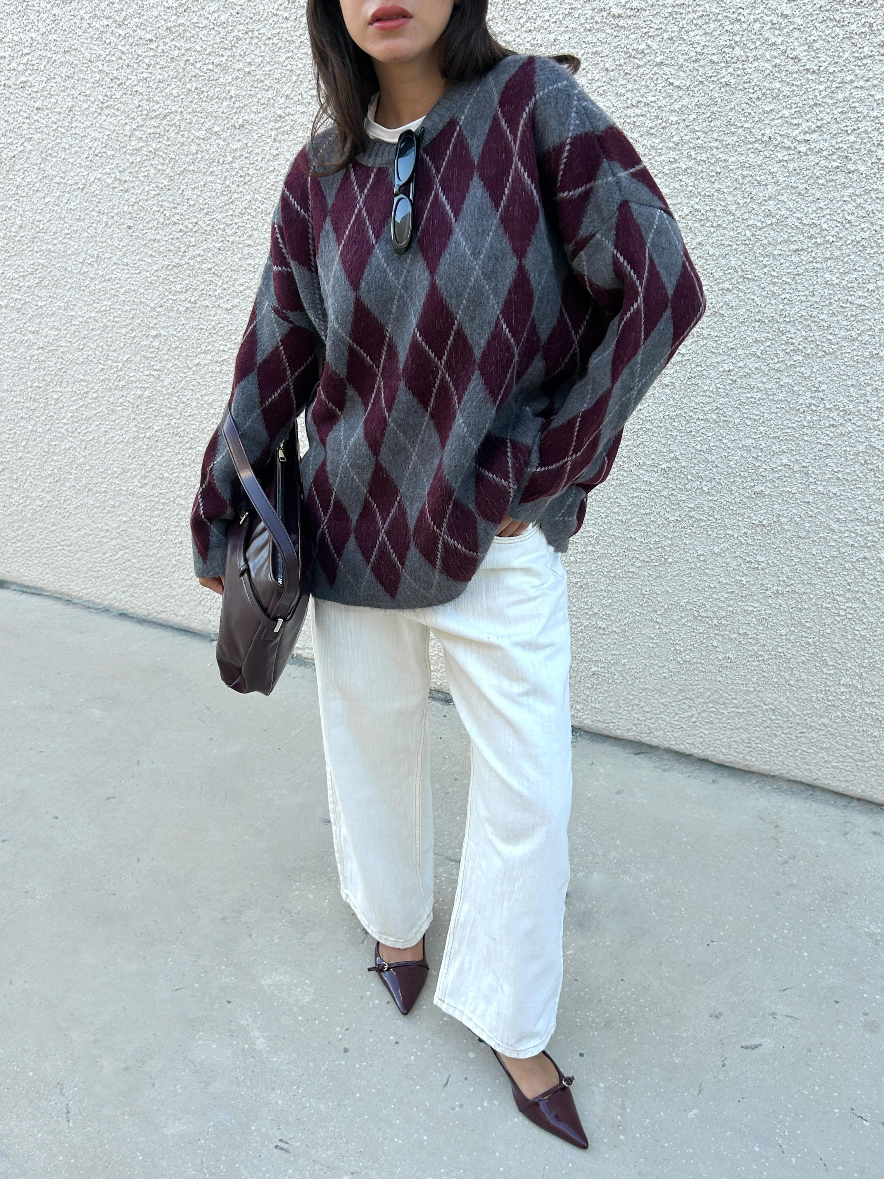 Kadın Bordo Oversize Şardonlu Ekoseli Yumoş Kazak 5581
