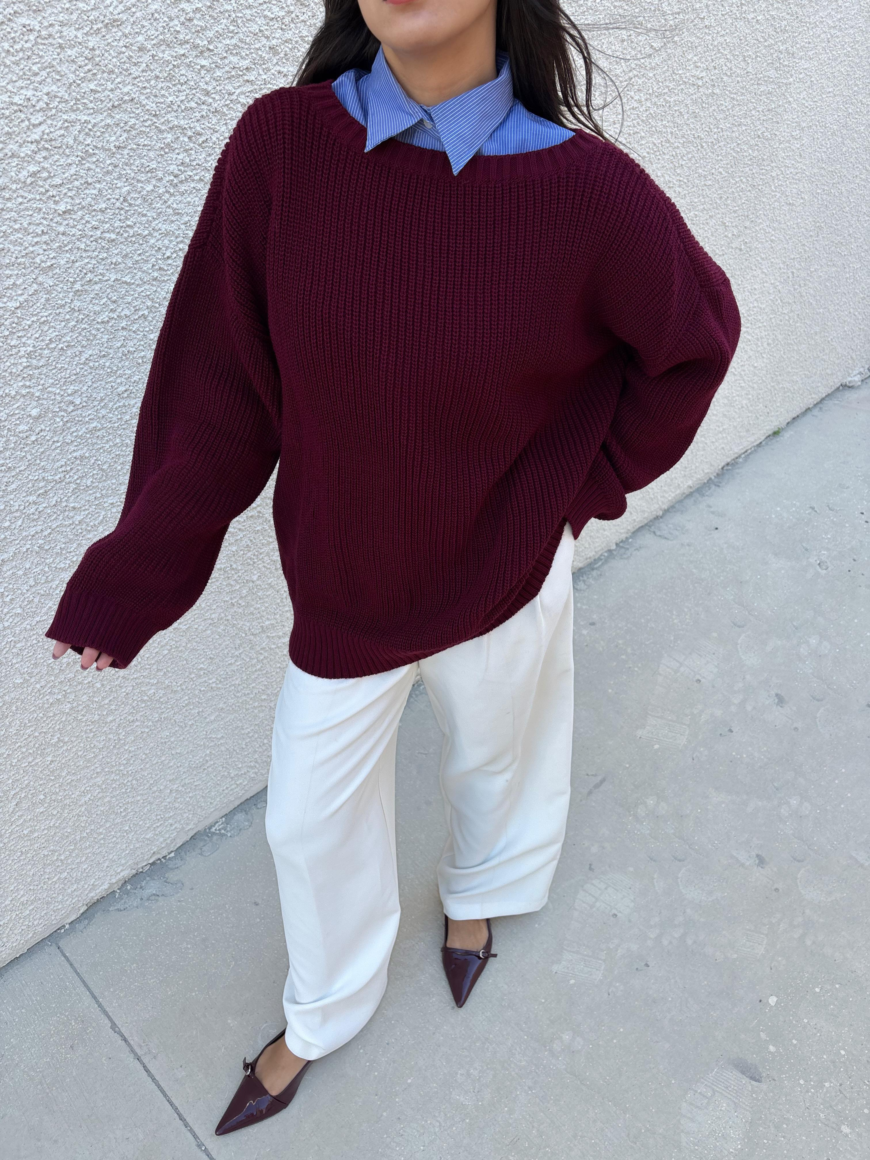 Kadın Bordo Oversize Selanik Örgü Triko Kazak