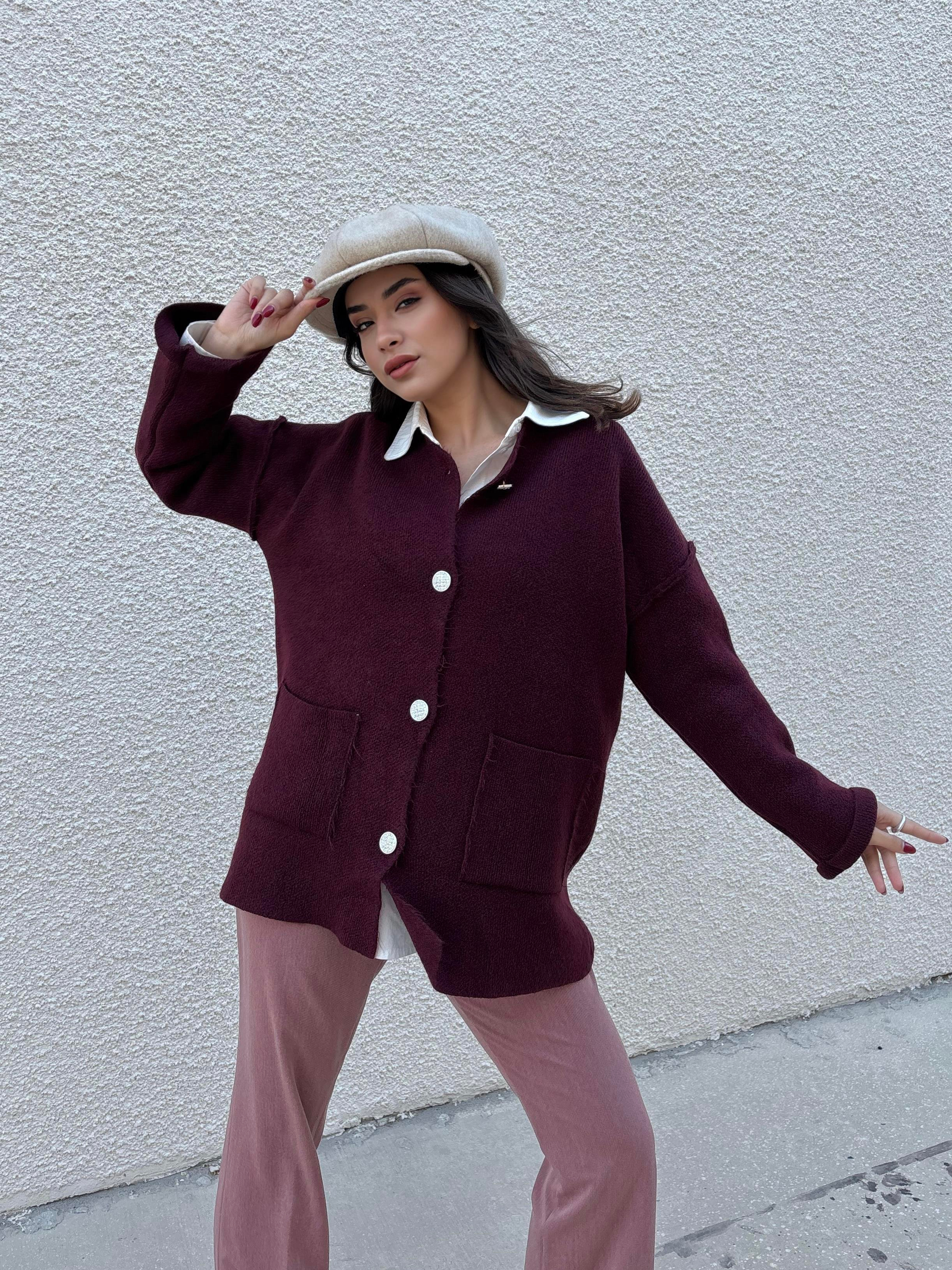 Kadın Bordo Oversize Taşlı Düğmeli Cepli Uzun Hırka 38