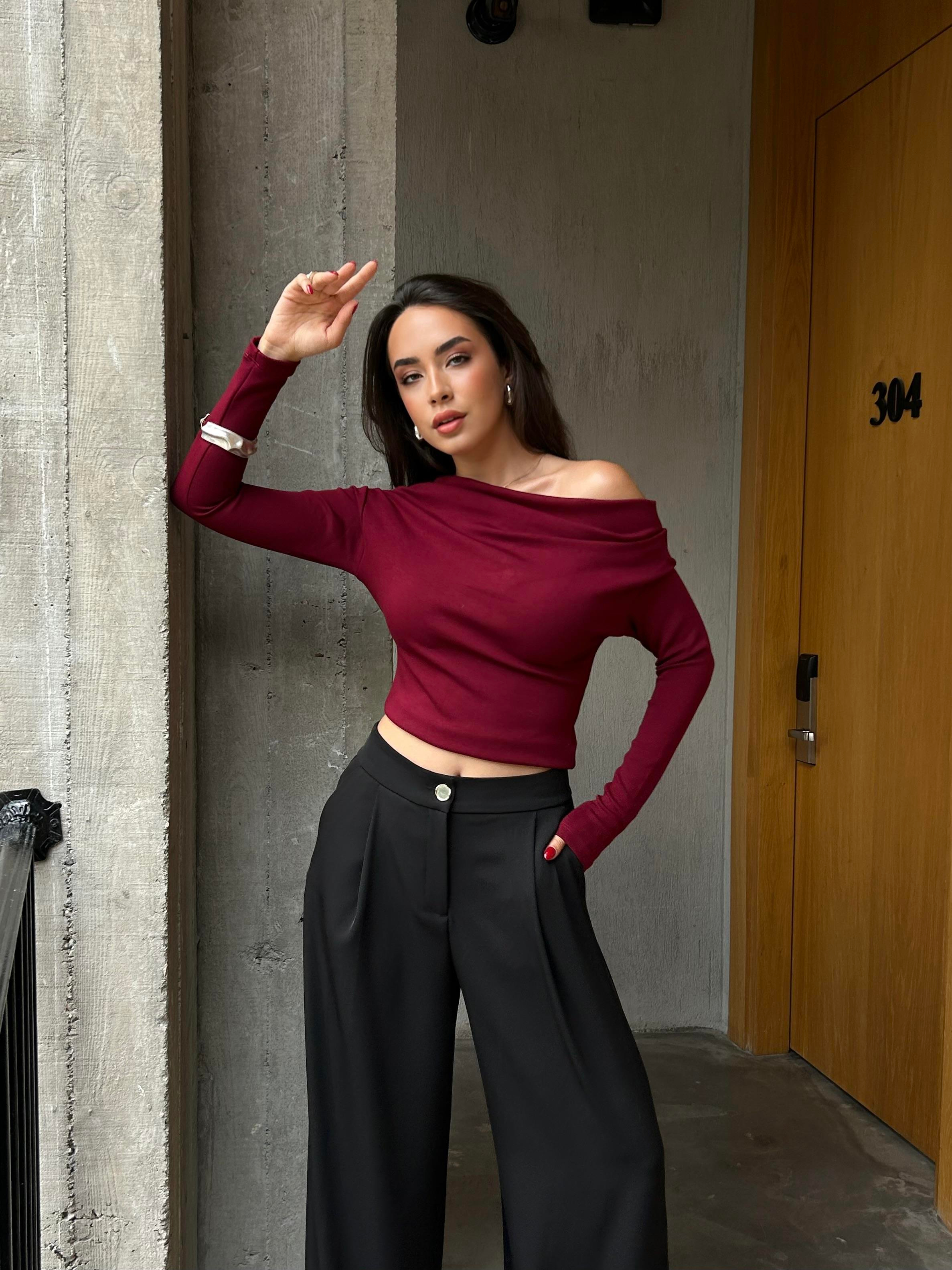 Kadın Bordo Uzun Kollu Düşük Omuz Bluz 30079 (30079)