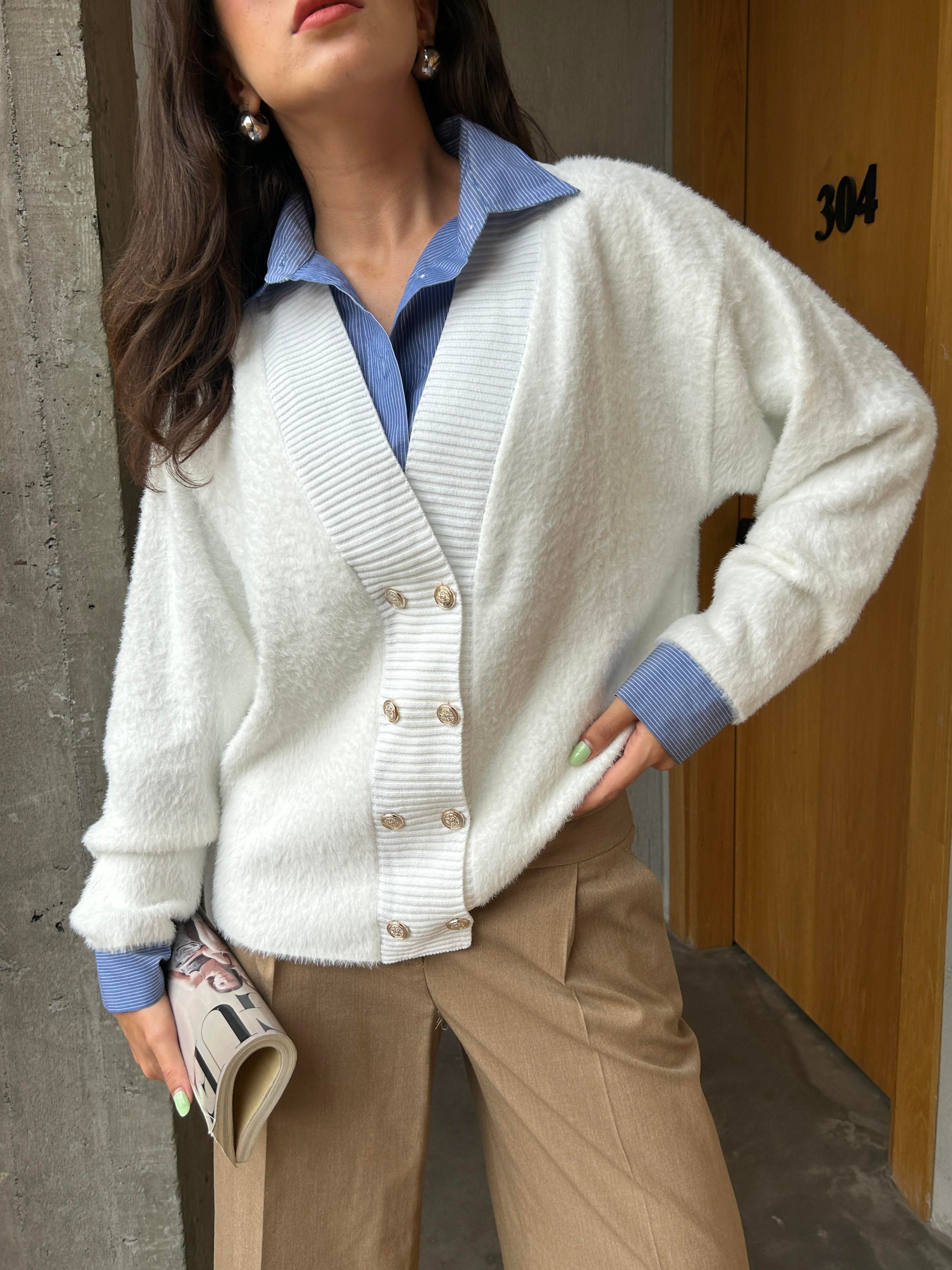 Kadın Ekru Gold Düğmeli Hırka Peluş Dokulu 114