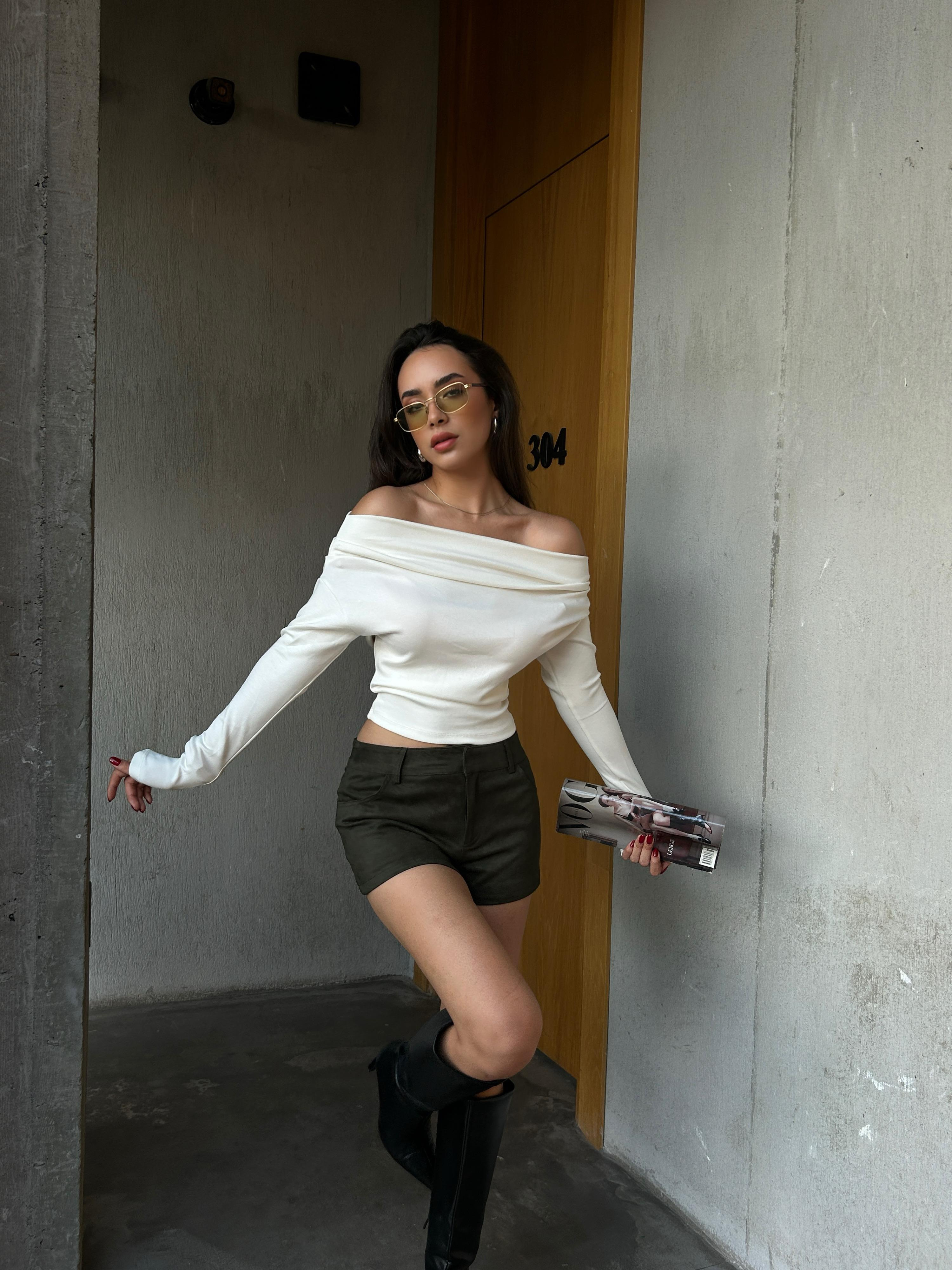 Kadın Ekru Uzun Kollu Düşük Omuz Bluz 30079