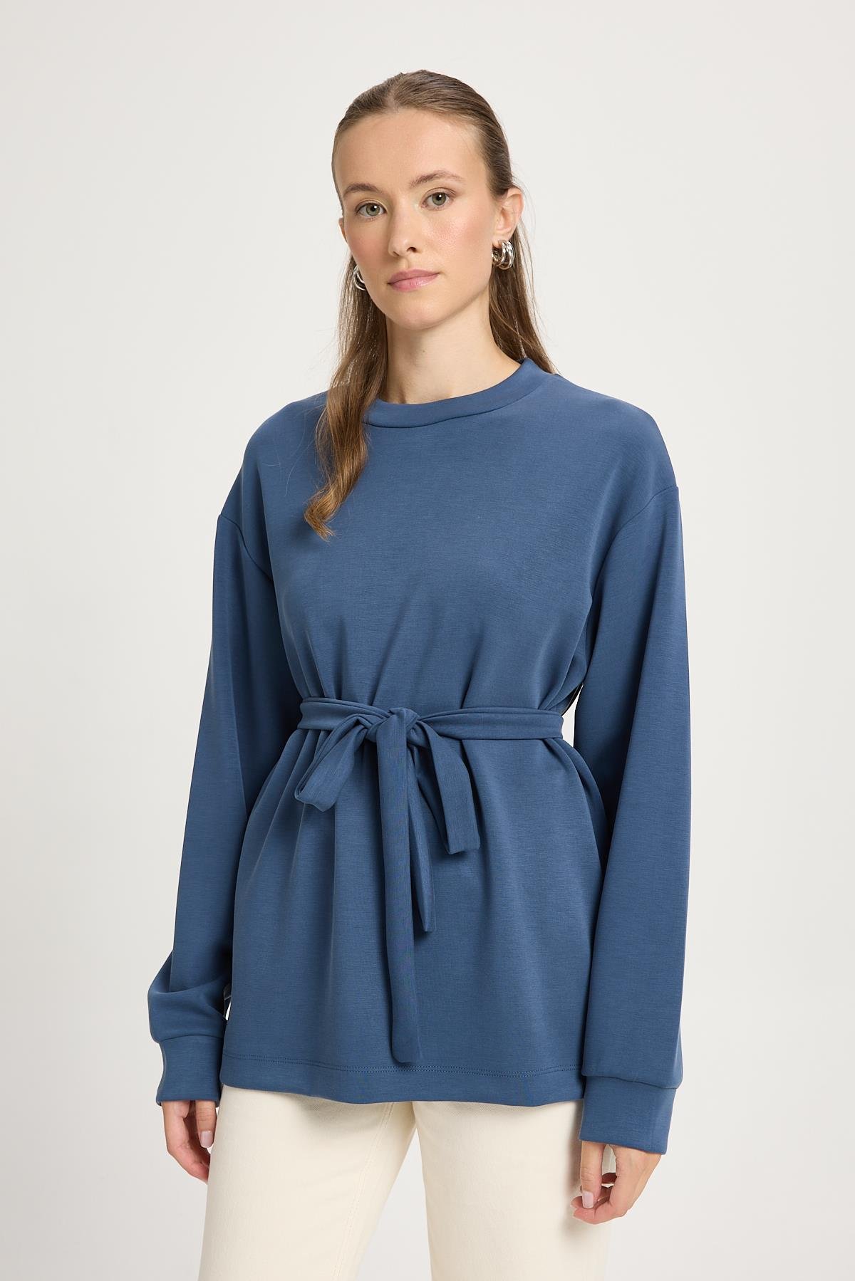 Kadın İndigo Oversize Kuşaklı Modal Kumaş Yumuşacık Bluz 30003