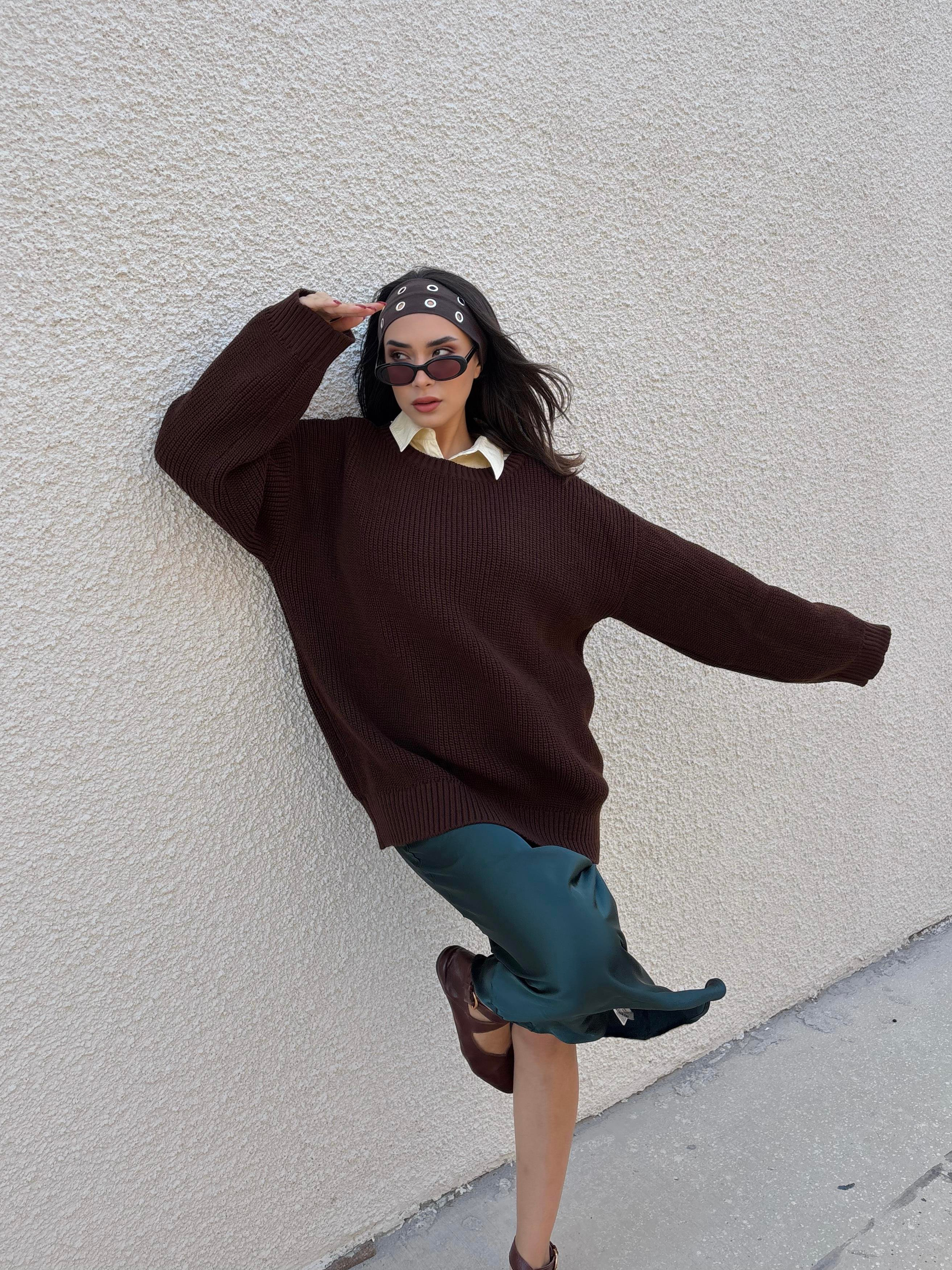 Kadın Kahve Oversize Selanik Örgü Triko Kazak  30057
