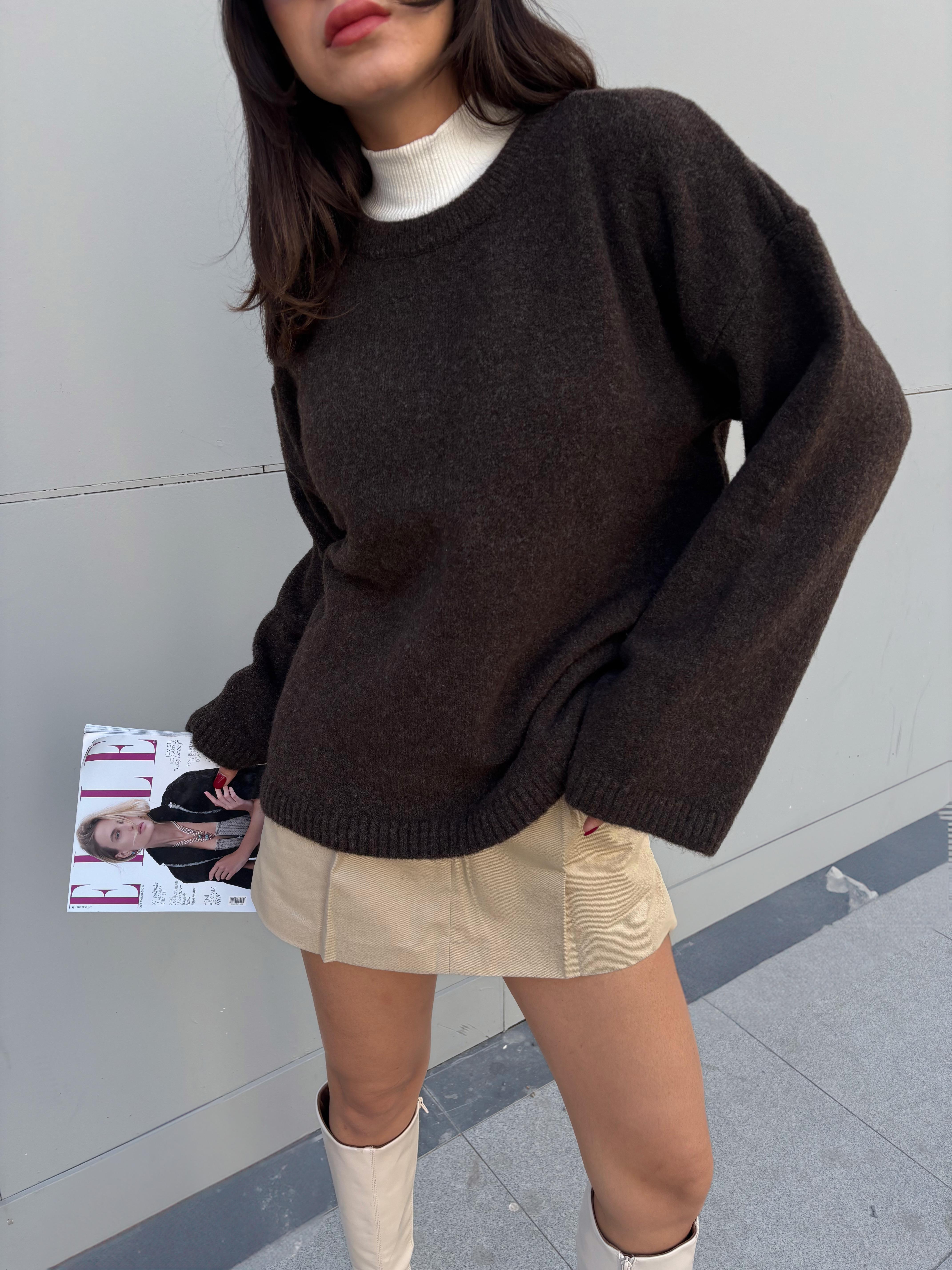 Kadın Kahve Oversize Yumoş Dokulu Kazak 7014