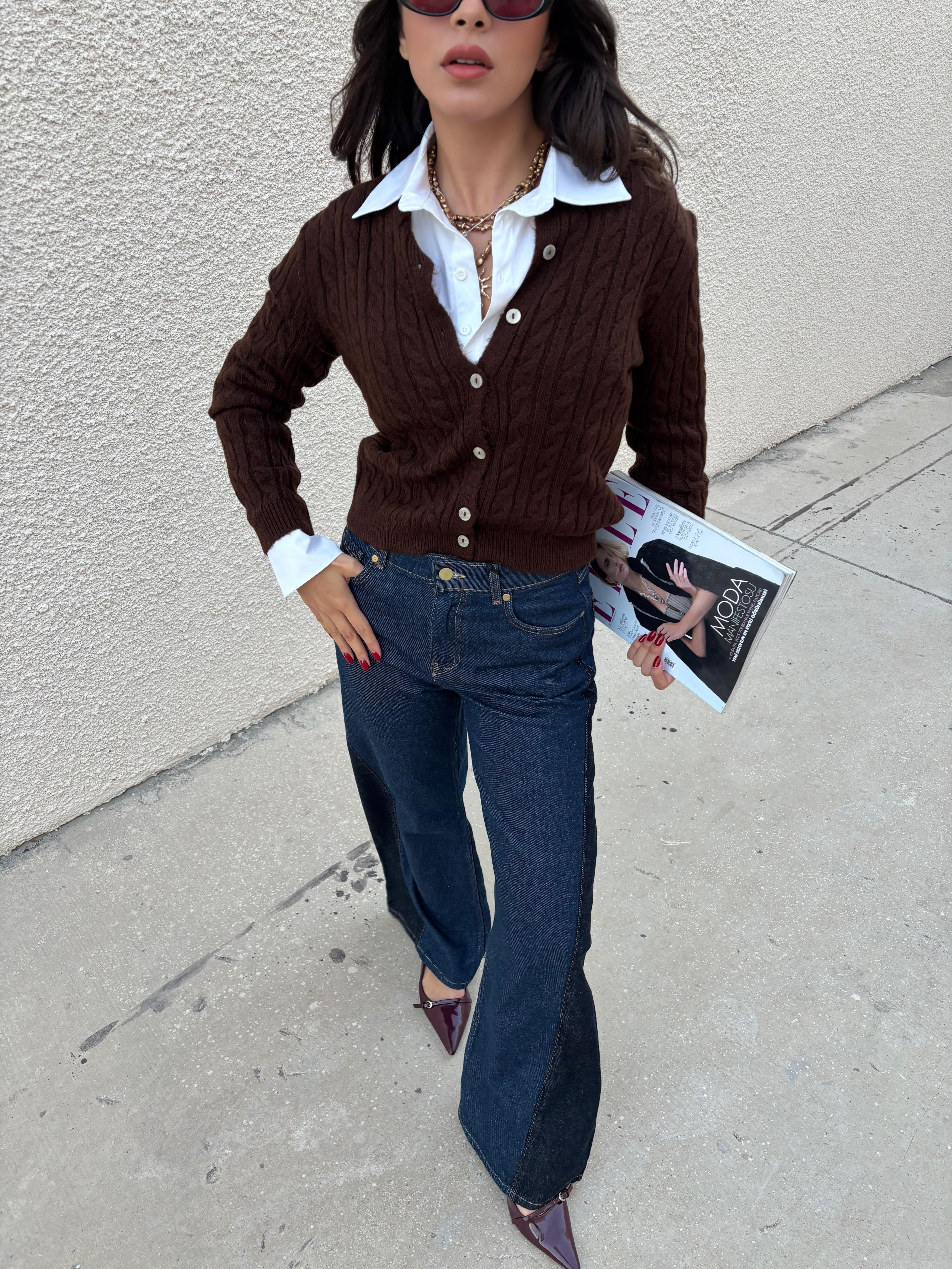 Kadın Kahve Saç Örgü Taş Düğmeli Kısa Hırka 30033