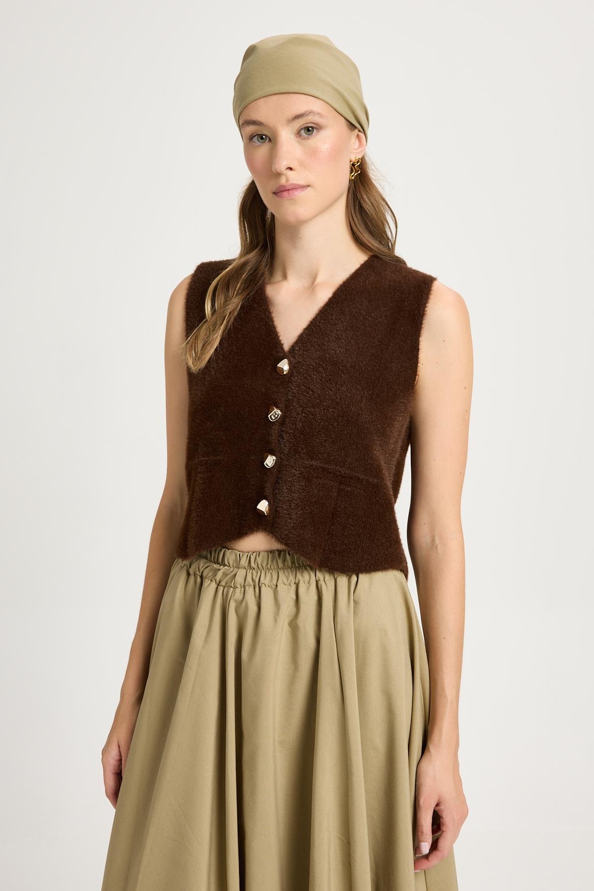 Kadın Kahve Triko Yelek Gold Düğme Detaylı Yumuşak Dokulu