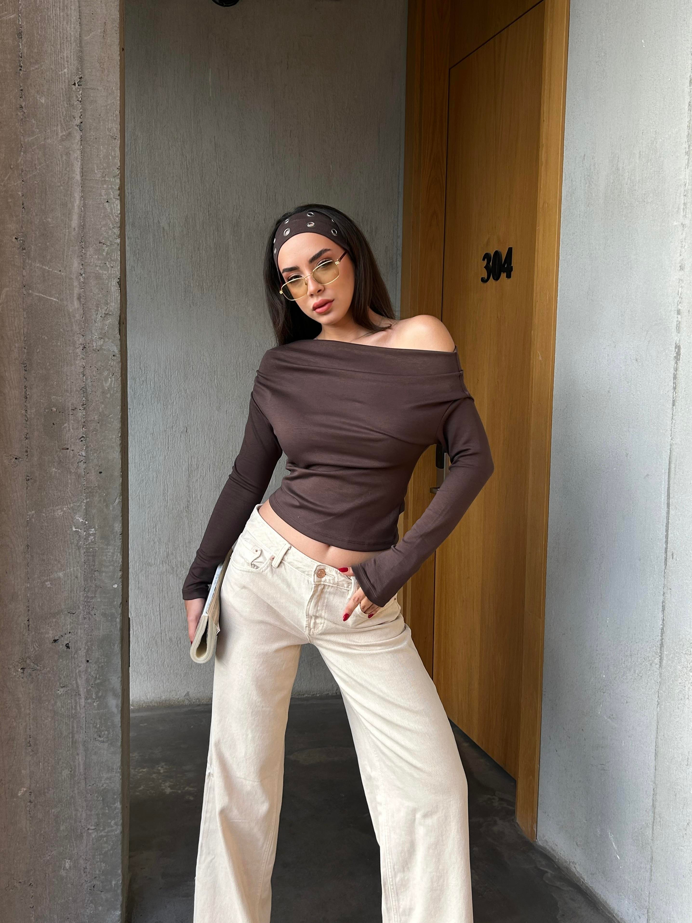 Kadın Kahve Uzun Kollu Düşük Omuz Bluz 30079