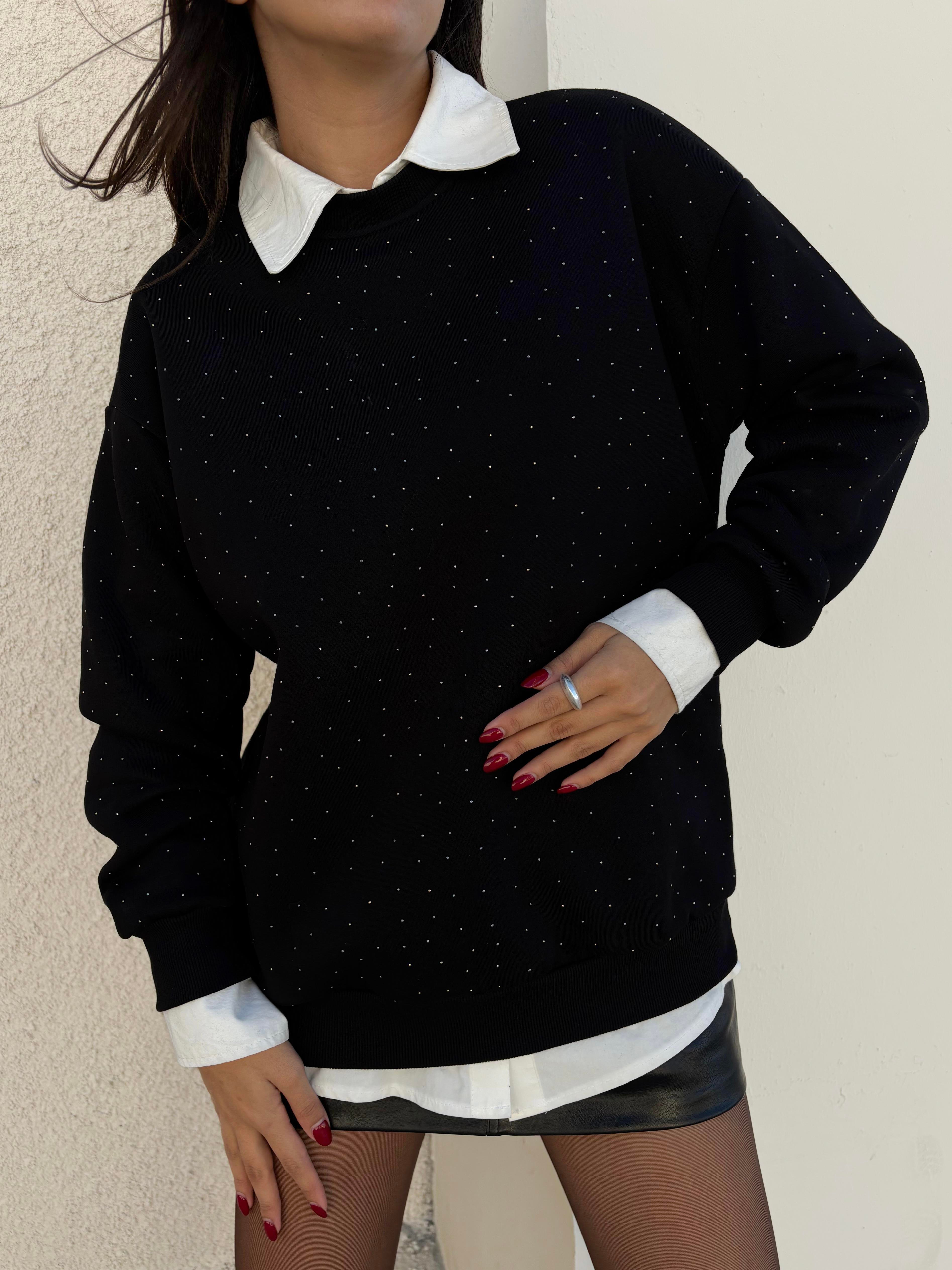 Kadın Siyah Taşlı Oversize Sweatshirt 30067 (30067)