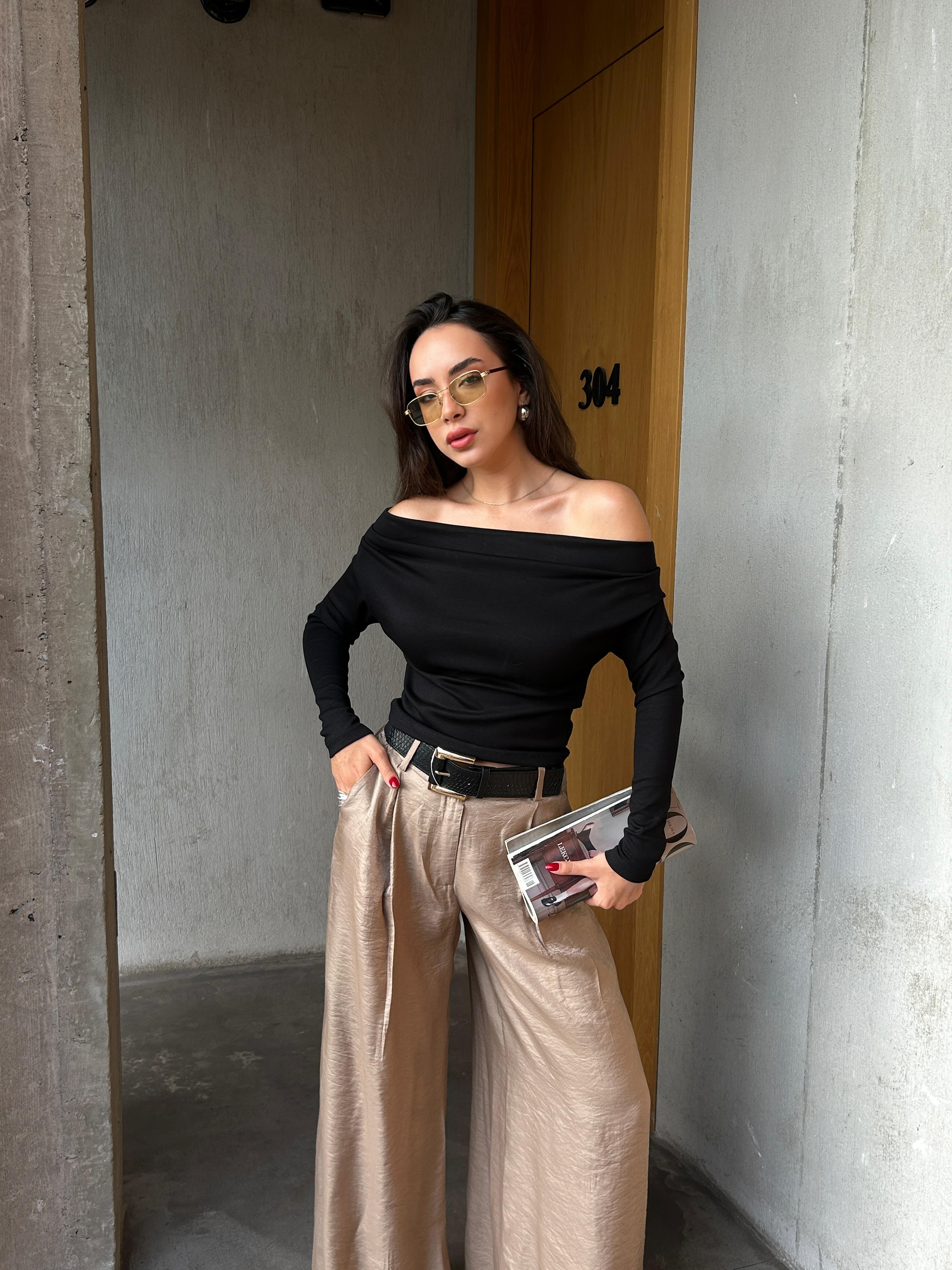 Kadın Siyah Uzun Kollu Düşük Omuz Bluz 30079