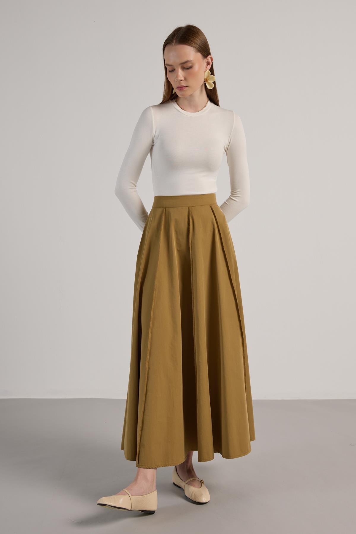 Kadın Yağ Yeşili Parçalı Dikiş Detaylı Premium Uzun Etek 30054 (30054)