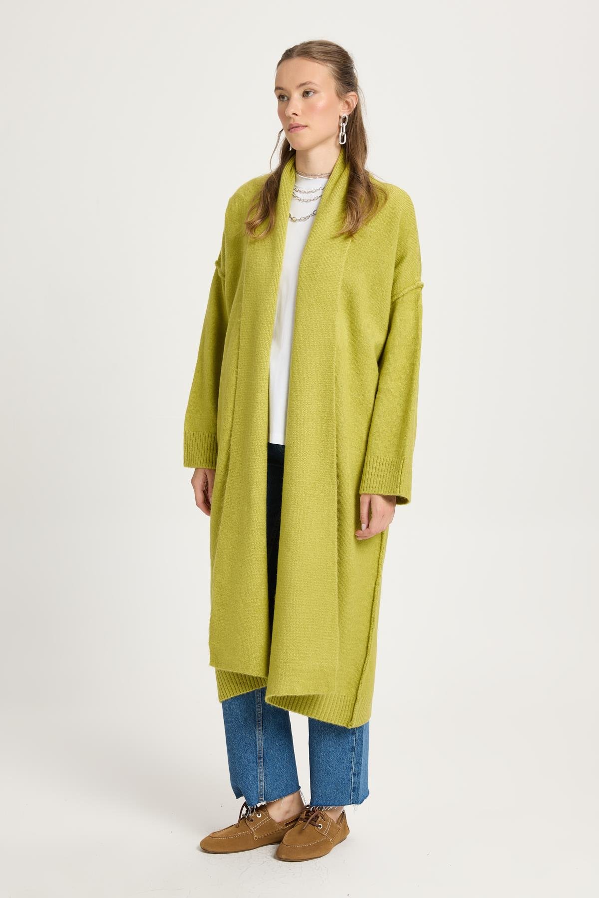 Yağ Yeşili Pis Dikiş Detaylı Uzun Oversize Yumoş Triko Hırka 26257