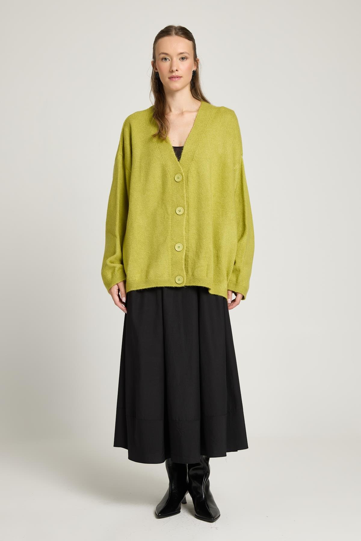Oversize Düğmeli Triko Hırka Yağ Yeşili (24106)